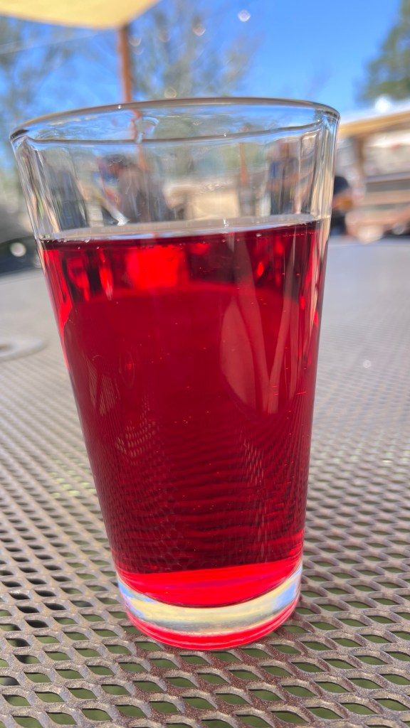 After ordering we took our beverages out to the patio and found a table, and old whisky barrel with a new top & high bar stools and we were set.