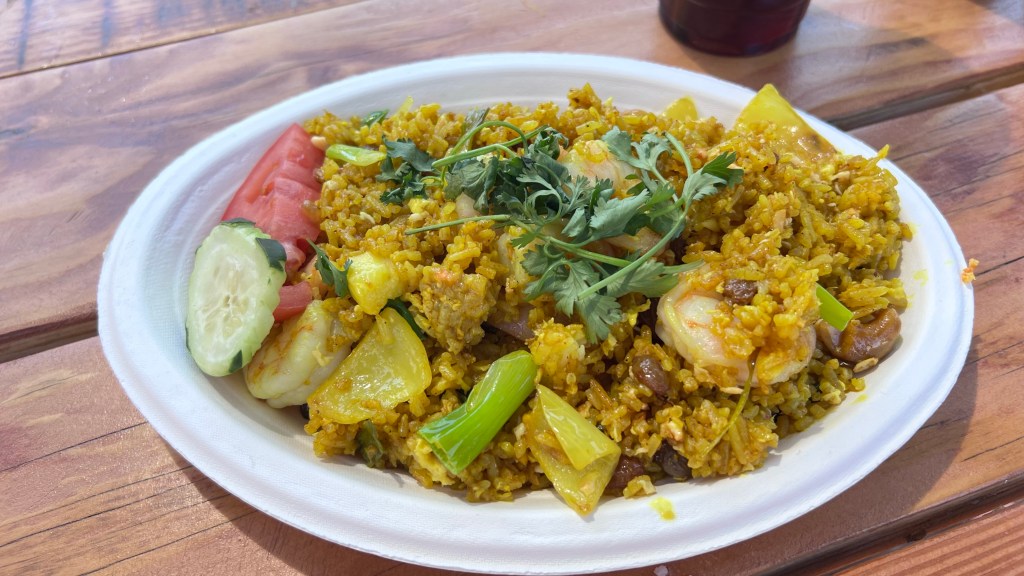 Lunch: pineapple 🍍 shrimp 🍤 fried rice 🍚 – Jasmine rice 🍚 infused with yellow curry flavor stir-fried with Pineapple 🍍 shrimps 🍤, cashew nuts, raisins, and onions 🧅. $12.95
