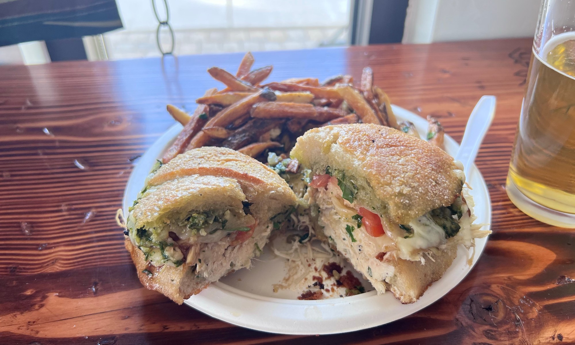 Lunch: Chicken 🐓 Pesto Sandwich 🥪$16-Popular sandwich with chicken 🐓 , house-made pesto, fontina cheese 🧀 , fresh basil 🌿, fresh tomato 🍅 , and balsamic glaze on a Pandura roll 🥖 from the Village Baker. Served with your choice of fries 🍟, garlic fries 🧄 🍟, or a side salad 🥗.