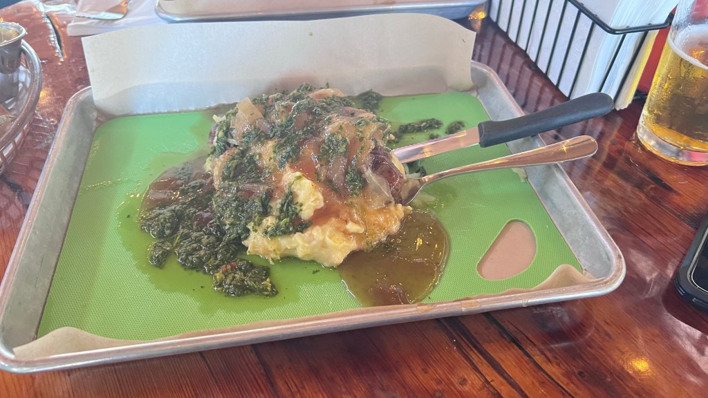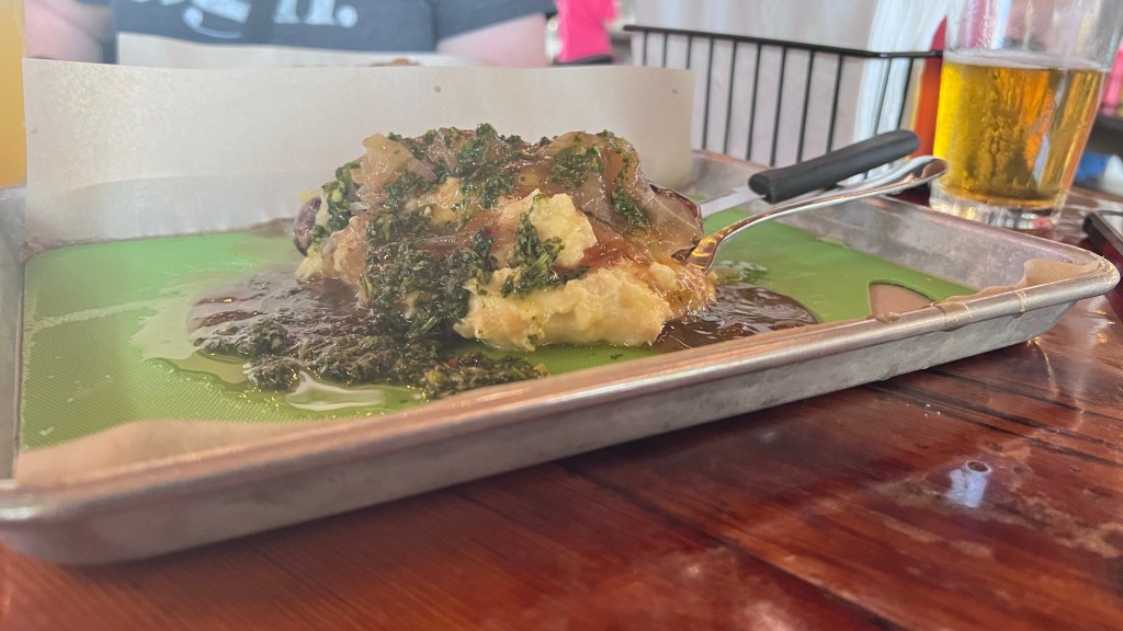 The chimichurri is nice with a cilantro kick, gravy is semi sweet & pairs well with the slightly gamey sausage, carmelized onions are a little under cooked and gives a nice texture difference to the sausage and potatoes. The sauerkraut portion is a little lacking but flavorful & melds well with the rest of the components.